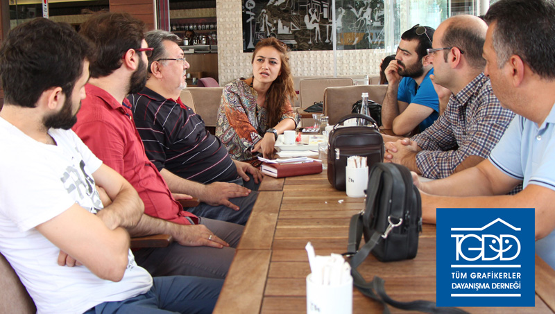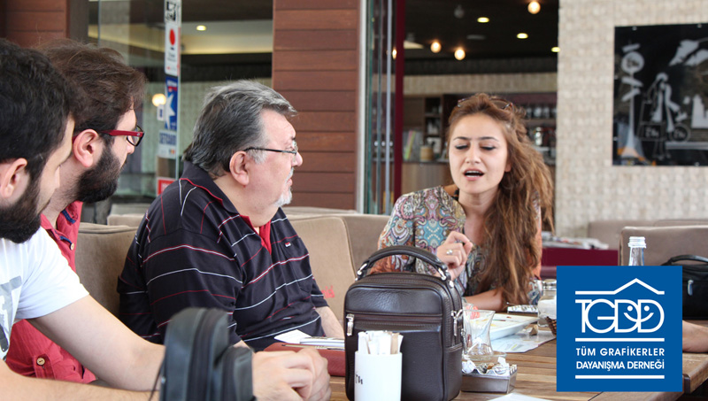 Başkan Çağla; bazı grafikerlerin aylar önce bir başka grafiker derneğinden hukuki yardım talep ettiğini fakat yardım alamadığı için TGDD’ye başvurduğunu söyledi. Bunun üzerine Avukat Tuğçe Hanım, bu diğer Grafiker Kuruluşunun kim olduğunu sordu ve Başkan Çağla; bu derneğin 36 yıllık bir meslek kuruluşu olduğunu, toplam 300 üyeye sahip olduğunu, ilk kurulduğu yıllarda gerçekten duayen hocalar ve grafik tasarımcılar tarafından kurulduğunu ve ilk 15 yıl çok mükemmel hizmetler yaptığını, 1990’dan sonra giderek amacından uzaklaştığını ve hakim sınıfların dümen suyunda ilerlemeye başladığını ve grafiker sorunlarını ve grafikerliğin mesleki sorunlarını dert etmediğini anlattı.