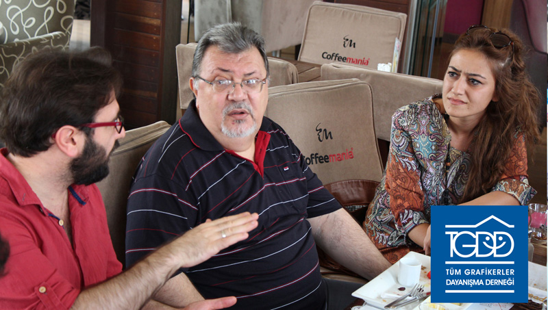 Serdar GÜNGÖR’e sabahki toplantının kısa bir özeti yapıldı. Güngör; yepyeni bir iş bölümü modeli ve görev dağılımı gerektiğini söyledi. Bu konuda planları olduğunu ve bunları Dernek Yönetim Kurulu ile paylaşacağını, derneğin sadece işçi grafikerler derneği olmadığını, mesela bir matbaaya giderek grafikerlerden yana dertlerinin olup olmadığının bile araştırılması gerektiğini, bu hususta TGDD’de araştırmacı ve gezici ekiplerin oluşturulması gerektiğini , çok geniş bir iş bölümü ve görev dağılımın olması gerektiğini söyledi.