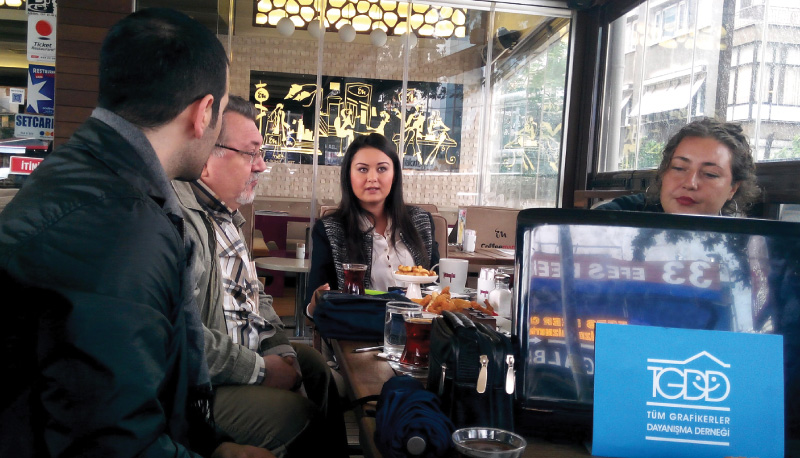 Toplantıya aşağıdaki ilk fotoğrafta görüldüğü üzere (soldan sağa) Av. Başak Defne KAYA, Grafiker Ertuğrul ERDOĞAN (Grafik ER), TGDD Genel Koordinatörü Mustafa MEYRİLİ (Grafik ÇAVUŞ), Grafiker Serkan KIRBAŞLI, Matbaa Sahibi Binnur KOSOVA, Grafiker Mukaddes Esin ERGÜN, Grafiker Ali TEKDEMİR, Gazeteci Ercan Sadi İSTİKLAL, TGDD Yön. Kur. Bşk. Faruk ÇAĞLA ve TGDD Saymanı Erdem ÇAĞLA (Fotoğrafları çeken) geldiler.